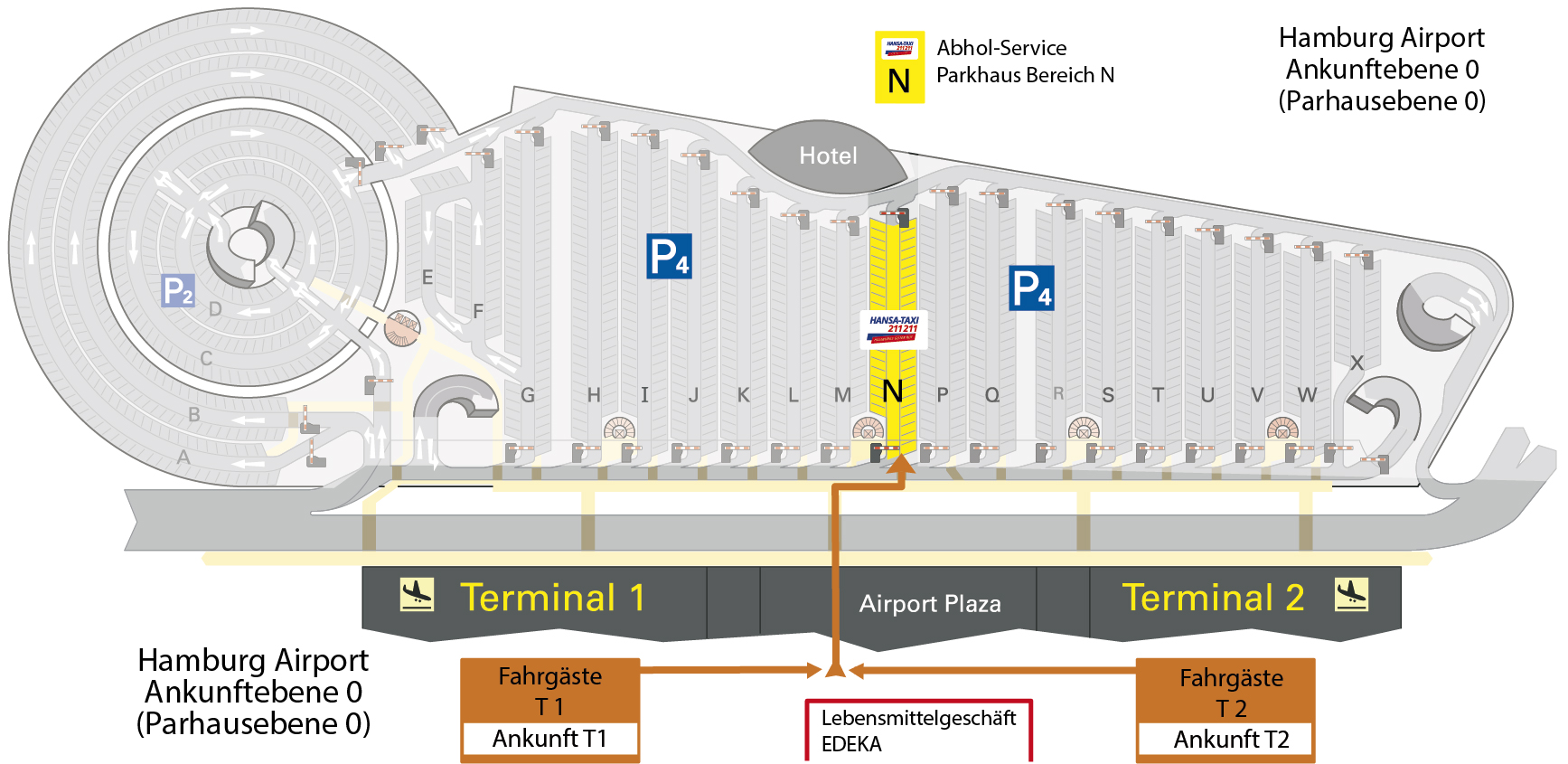 Hinweis: Gehen Sie bitte vom jeweiligen Ankunftsbereich innerhalb des Terminals zum Airport Plaza (Höhe Lebensmittelgeschäft EDEKA) und von dort durch die Drehtür Richtung Parkhaus zum Bereich N.